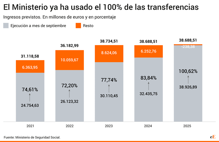 La falta de nuevos Presupuestos Generales del Estado desde el año 2023 hace que las cuentas que manejan los Ministerios necesiten, cada vez más, ampliaciones para poder sufragar sus gastos. Esta circunstancia se ve reflejada en las cuentas de Seguridad Social, cuyo gasto en pensiones crece año tras año por la llegada de la jubilación baby boom a la edad de retiro, la revalorización de la prestación, la mayor longevidad de los jubilados y las nóminas más elevadas con las que estos finalizan su carrera. Como consecuencia, este año, la Cartera de Elma Saiz ha consumido el 100% de las transferencias del Estado tres meses antes de que finalice el año, según el Resumen de Ejecución Presupuestaria publicado por el Ministerio de Seguridad Social. Algo que el año pasado no sucedió hasta noviembre, a solo un mes de fin de año.